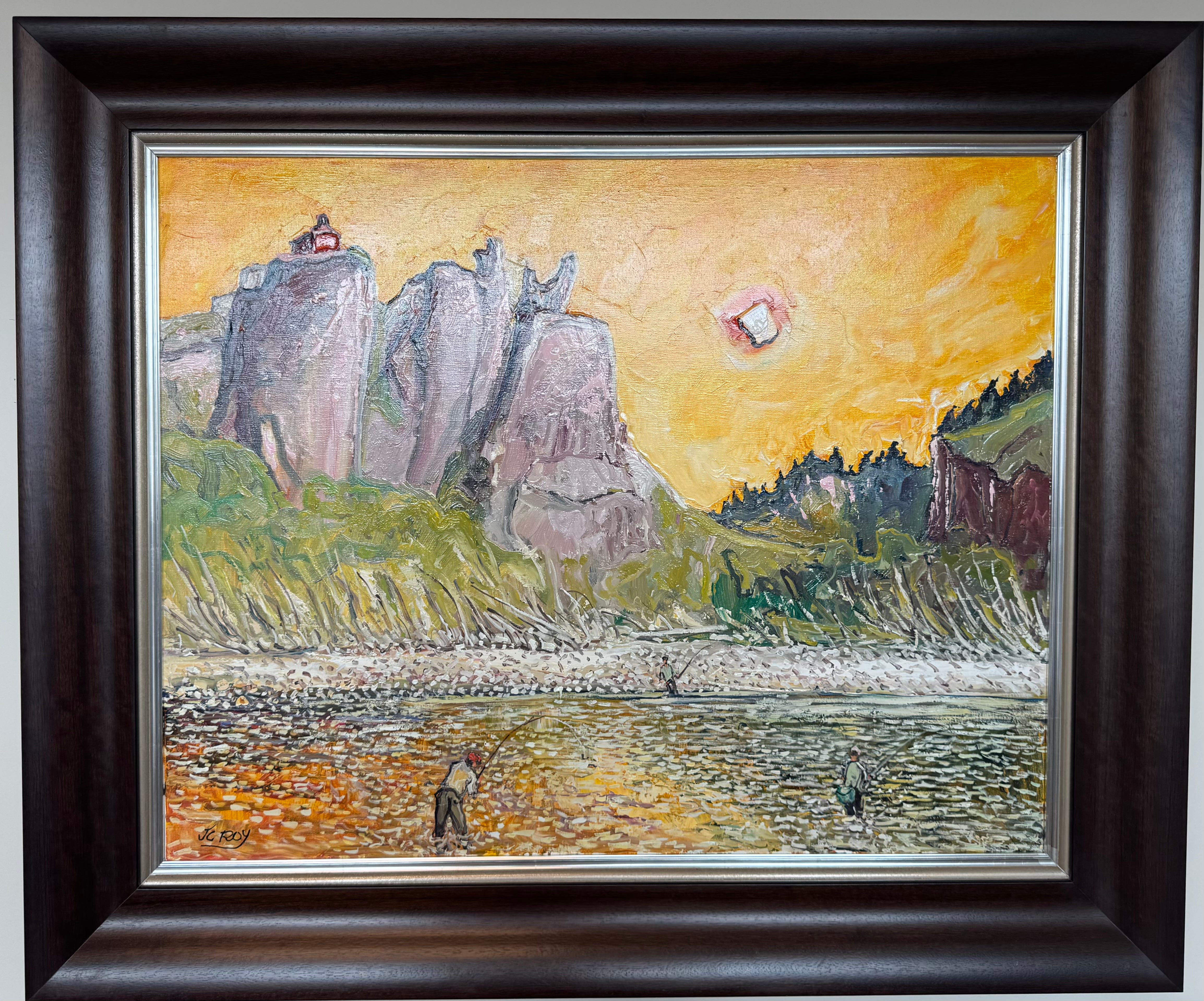 Happily, last summer I bought a painting by a French-Canadian artist, Jean Claude Roy, whom I had admired since viewing some of his pieces in the gallery at the Asheville Grand Bohemian Lodge a while back. This piece seized my attention the moment I saw it – so much yellow amidst other works with copious shades of blue, green, or perhaps red. And I spied a fisherman in the stream, wearing an orange cap. Ah ha! Love!