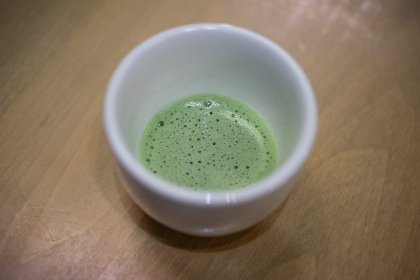 Matcha is a Japanese green tea that has been ground up into a fine powder. With most teas, you brew the tea then you strain the leaves out. With matcha, the powder is dissolved into the water and you drink it whole.